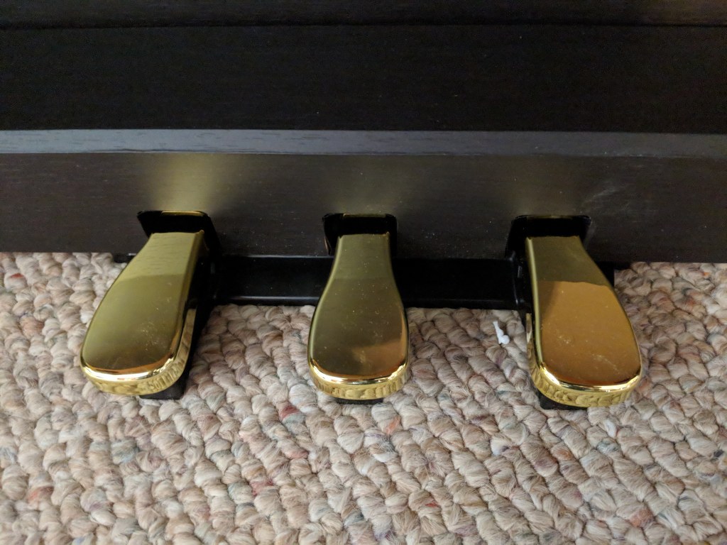 The triple pedals do work and the right side sustain pedal does its job overall. But even though those 3 pedals have a brass color, they are not brass pedals but instead are plastic. Plastic is fine as long as they work. But our experience using those pedals was a bit disappointing because the pedals, just like the key action, were noisy & clicky sounding when moving up and down and it was somewhat distracting when playing music on the piano. As for the sustain pedal (the 1st pedal on the right), it worked OK, but just like the key action, the sustain response was not always consistent when pressing down on the pedal and the pedals themselves were quite stiff/hard to press down as compared to a real piano and other digital pianos we have played so those pedals are on the low end of quality.