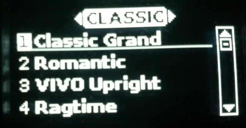 Once you get this piano powered up then the H7/H3 defaults to the VIVO grand piano sound. There are 6 different acoustic piano sounds and they are called VIVO Grand, Pop Grand, VIVO Live, Classic Grand, Romantic Grand, and VIVO Upright Piano, and all of those pianos are in stereo reproduction.