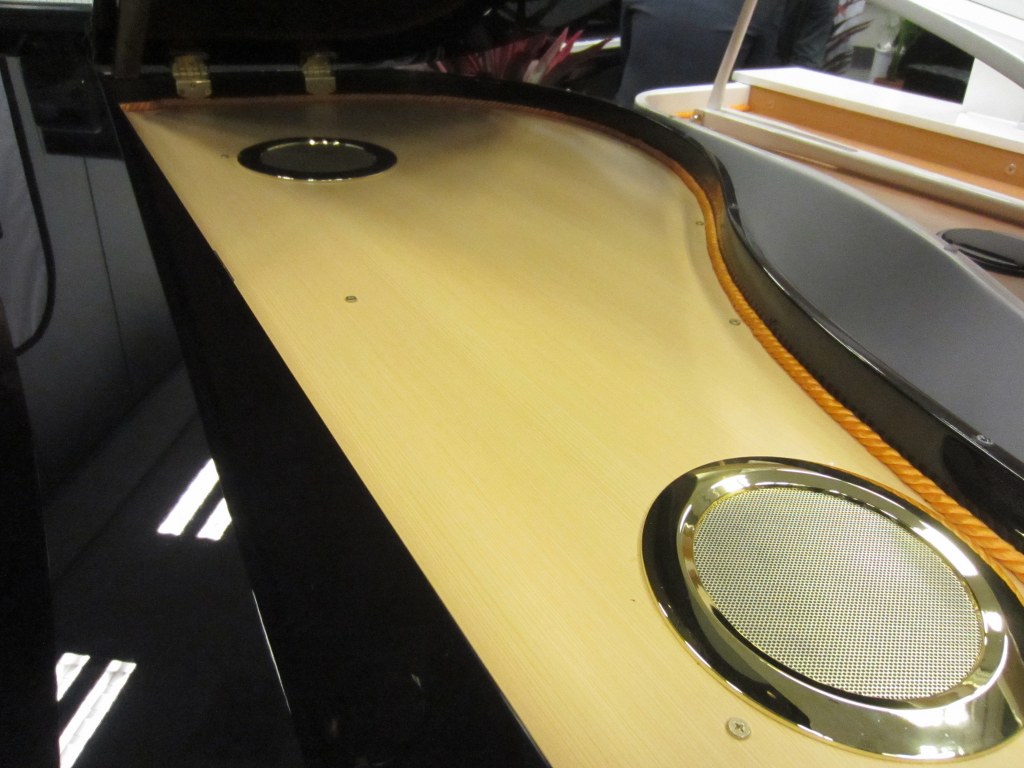 The newer Orla Grand 500 mini grand is 4 feet in depth so it is a good size and looks like a slightly smaller version of a real acoustic baby grand piano. Real acoustic baby grand pianos usually measure around 5′ is depth so the 4 foot depth measurement of the Grand 500 (also known as a “mini” baby grand size) is a better size for most people because it can fit in better to more spaces. For those who are “space challenged” in their home, church, school, or other venue, then the Grand 120 at just 2’8″ (32″) in depth which is also known as a “micro” baby grand because of its much smaller size, maybe a better option for you. But there are some noticeable differences in cabinet design for that model as compared to the Grand 500. The interior of both models has a wood color/tone soundboard with speakers placed into the soundboard at the proper alignment for sound, and then finished off with attractive brass coverings.