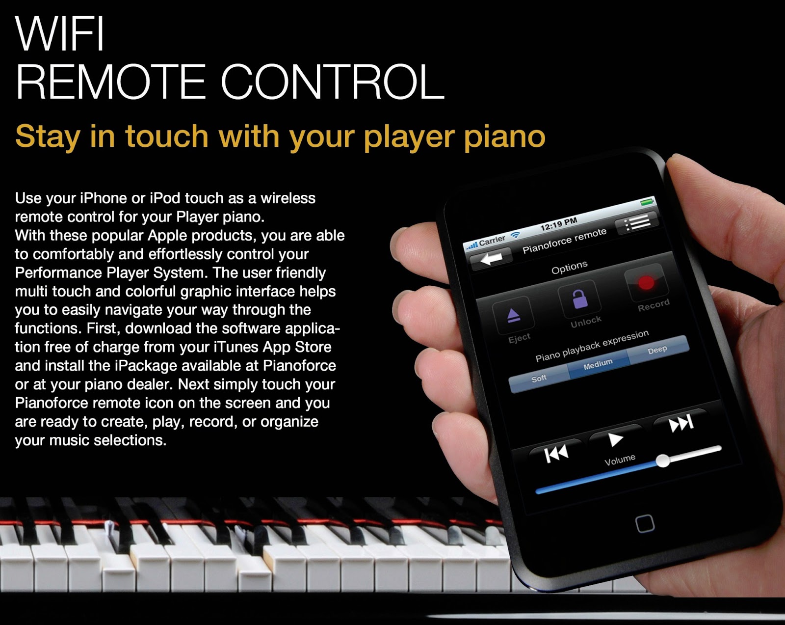 The Stahler Grand piano sizes come in a depth of 4’10”, 5′, and 5’4″ and they also make a 48″ upright player piano too. The on board player system can play a variety of CD’s from QRS Pianomation library, Yamaha library, MIDI piano files, WebOnlyPiano discs library, Pianoforce library, Pianoforce Internet streaming radio (optional), and Pianoforce internal song library for 1000’s of available player songs along with full orchestral or band accompaniment coming through a powerful external sound system mounted under the Stahler piano.The Stahler Pianoforce system also has an optional wi-fi remote control using iPod & iPad with an “easy to navigate” software app to control the player system with a variety of features which is pretty cool and so it takes the place of the remote control that comes with the piano.