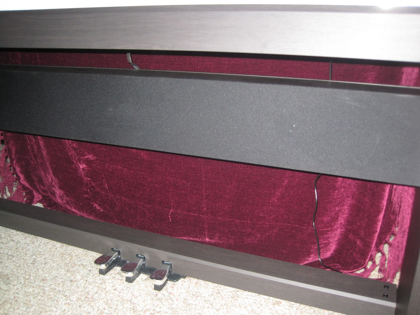 The SD10 has a fairly powerful stereo speaker system for its size with 30 watts of total power and the two 5″ speakers it has are not on the top but instead underneath the piano facing forward (left pic). This is OK but having the speakers on top of the piano and then additional speakers facing down or out would have been better because that’s the way acoustic pianos work having the sound project upward (on grands) and/or nearer to your ears instead of just away from you below your waste. The pedals seem to work fine in duplicating the basic function of piano pedals, although it does not duplicate the graduated half pedal function (such as what the Yamaha & Casio digital pianos have) which allows for more gradual pedal sustain you would get on traditional acoustic pianos. But at $799 for an instrument like this, that’s not surprising. The piano has 2 headphone jacks for private playing, an audio input jack, audio output jack, a USB MIDI output connection to computer or iPad which is a very cool thing to have to interface with those external devices, and also separate MIDI connections for other uses.