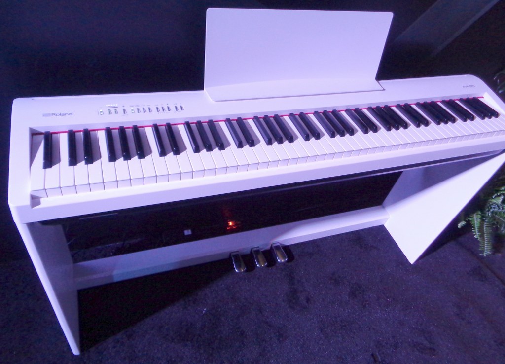 Overall this new Roland FP-30 is a welcome addition in this price range and I consider it to be a worthy competitor to the other major brands especially in the area of key action, piano sound authenticity, and pedaling function. When it comes to the fundamentals of piano playing, the FP-30 should be a definite consideration in my opinion for someone wanting a piano which focuses on the piano playing experience. The additional features in this model are all good including auto power off which turns the piano off after the it has been on and not played for awhile along with panel lock which prevents the features in the settings you did from being accidentally changed by someone touching the buttons. The cabinet is lightweight (31 lbs), easy to carry (51″x 12″ deep x 6″ high) looks very attractive in either a well built satin black or satin white cabinet which includes a large and supportive music rack, and has the ability to do many fun things. Of course, the FP-30 does not have a built in key cover so the keys are always exposed, although you can buy a fitted vinyl or cloth cover to put over the keyboard. But this is true of just about all the portable digital pianos. In my opinion, the FP-30 is a very good piano but it is not a great piano only because of the sharp “stretch tuning” to my ears, having no audio outputs which requires using the stereo headphone jack for an output, and having no display screen to more intuitively operate the piano functions. I also forgot to mention earlier that unfortunately, the FP-30 has somewhat weak volume output for stereo headphones. I have a great pair of stereo headphones and use them for private practice and examination of digital pianos and they project high volume on the other brands of digital pianos in this price range, even at medium volume settings on those pianos. But for some reason the FP-30 does not push my headphones much in terms of volume power coming out of the FP-30 headphone jacks and I have to max the FP-30 volume just to get an OK volume/fullness through the headphones. I don’t know what causes this issue but it can be a limitation for people who use headphones a lot and like bigger, fuller volume. I even tried other headphones on the FP-30 including Roland headphones and the results were the same. However, with all the positive things this portable digital piano has and does, it may be the perfect choice for you…and I must say, the internal speaker system in this model is quite good and really sounds big and full when the piano sounds are played through it. Roland is a great brand and has for many years had an excellent reputation in the music industry for reliable and innovative product, so the FP-30 should last for many years including having the Roland 3 year parts and 2 years labor warranty for your protection.