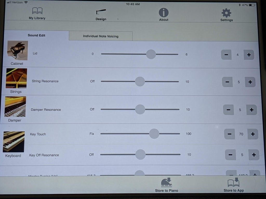 The other proprietary app that Roland offers is called “Piano Designer.” Piano Designer has been out for a number of years and works on nearly all of their digital pianos although you would use the settings and features for the specific Roland piano you are using assuming you set it up that way. Every Roland digital piano has their own settings and their own controls on this app. The Piano Designer app is actually pretty cool because you can get into more of the piano sound organic elements and customize them to your liking assuming you would want to do this. These specific areas of the piano sound include lid, string resonance, damper resonance, key touch, key off resonance, single note tuning, single note character, and single note volume. You can control those individual aspects of the piano sound and increase or decrease the amount that you want of each one.CONTROL PANEL