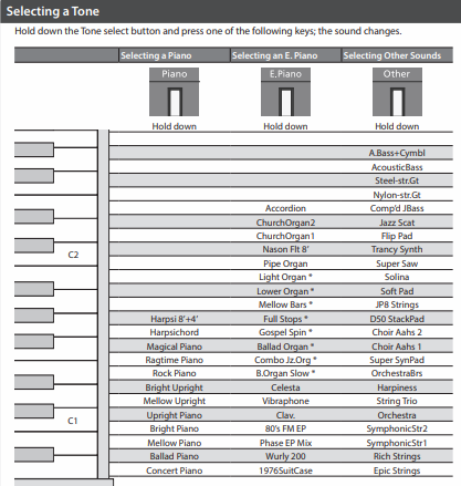 The 1st thing that most people would want to use is the instrument sound navigation chart inside the Piano Every Day app. There are 9 categories of instrument sounds that you can access in the app including Piano, Electric Piano, Organ, Strings, Pad, Synth, Other, Drums, and GM2 (General MIDI sounds). Once you select the instrument category you want then you select the specific instrument sound in that category and the the FP-30X will be instantly setup for that sound. For instance, in the Piano category there are 10 acoustic type pianos and 2 harpsichord sounds for a total of 12 sounds. Harpsichords have strings and keys like a piano so Roland included those 2 harpsichords in the Piano category so when you go to the list of pianos you will also see those 2 harpsichords.