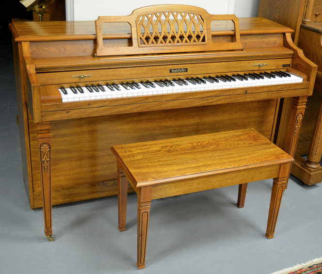 other flat-top pianos like this, is positioned in a good, convenient place attached to the front of the key cover when opened.