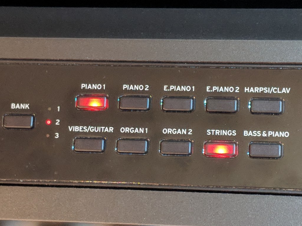However, regardless of what sound you have selected, there is a default piano button which always takes you back to the #1 acoustic piano sound in this model so in that way you can easily get back to the main piano sound. Also on the control panel there is a 2-track digital MIDI recorder so that you can easily and quickly record what you are playing and then play it back. You can record left hand piano playing and right hand piano playing separately and then play them back simultaneously to see who you are doing with your practice or you can be more creative and (as an example) record a piano sound on the right hand and a string sound on the left hand separately or together and then play both parts back simultaneously and see how your musical creation sounds which can be a lot of fun.