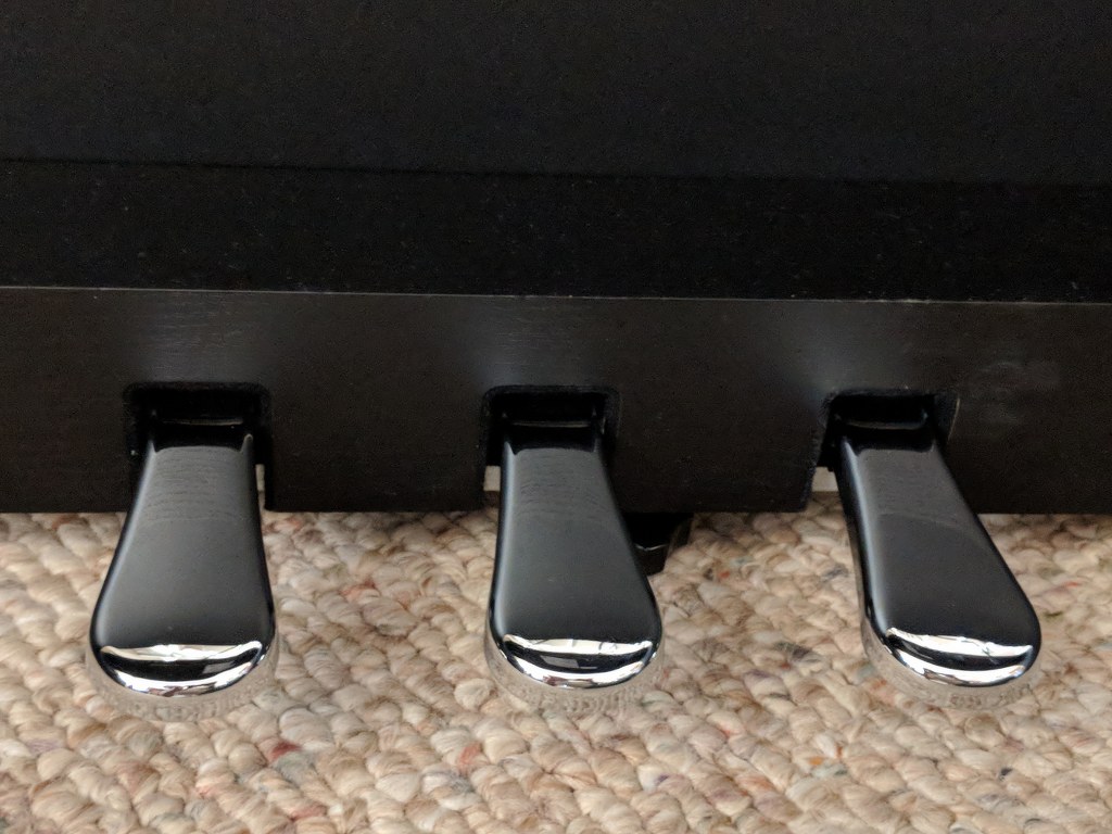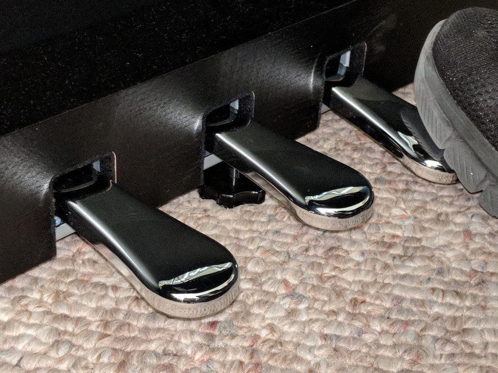 does have this sustain pedal function which is a very good thing, especially as a student improves in their playing skills. The 3 pedals pedals move well and have good response over all with a nice feel to them. The pedals are chrome plated which gives it a nice contemporary finish and contrast to the cabinet. I will say that when playing the piano and using the sustain damper pedal, I did notice that the pedal movement was noticeably noisy and clunky when the pedal comes back up to resting position after