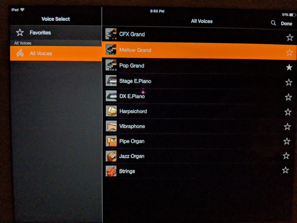 The Yamaha Smart Pianist app however has a few features that no other digital piano controller app has and that is being able to playback audio files from iTunes on an iPad and being able to see an instant chord chart of that song so you can see and know the chords as they are moving with the song. This is a very cool feature although it does translate or play all iTunes songs depending how they are actually saved in your iTunes iOS music library. The iTunes audio files also allow for speeding up and slowing down the song you have chosen as well as transposing that song to a different key…instantly…so that you can get it into a different vocal range or