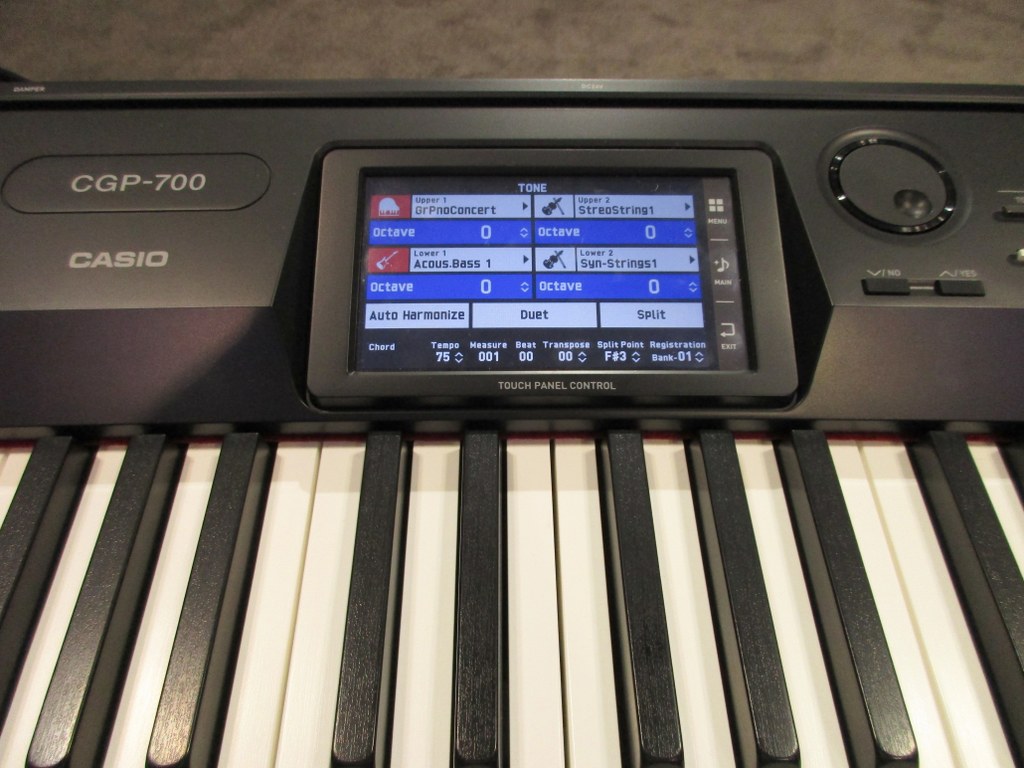 As I mentioned earlier, the Yamaha YPG-535 is a fun piano to play, has a cool user interface display (left pic), has good speaker volume, and if you don’t care at all about the key action weight and movement being like an acoustic piano or the piano sound being closer to a real piano over the the entire keyboard, then this piano could be a very good option for people who just want lots of cool electronic features, good quality instrument sounds, fun rhythms, interactive user interface, and USB flash drive input and USB output for direct connect to computers.| Casio CGP700 |